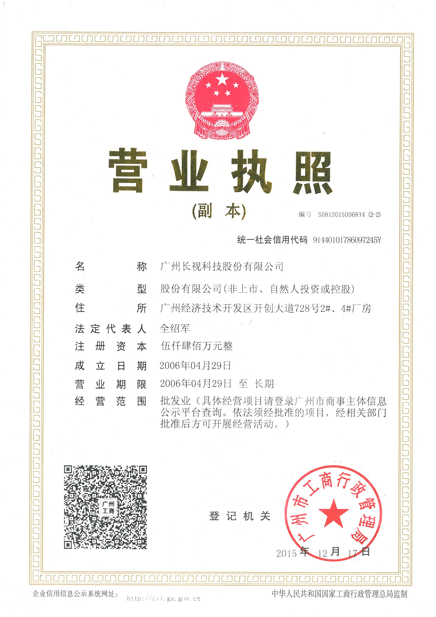 與此同時,隨著公司的發(fā)展,公司名稱由原來的廣州長視電子有限公司更名為廣州長視科技股份有限公司。以下是公司更名后的營業(yè)執(zhí)照